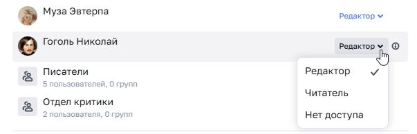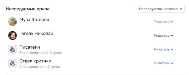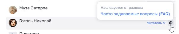 Пример: Николаю Гоголю выданы права «Читатель» на раздел. Статья наследовала эти права от раздела. Увидеть от какого раздела/статьи наследовались права вы можете, нажав на иконку «