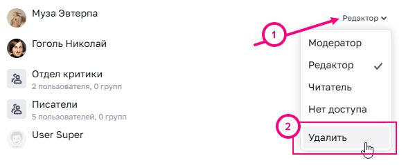 Для того, чтобы удалить раннее выданную роль нажмите на нее (п.1. на скриншоте ниже) и в появившемся списке (п.2.) выберите «Удалить». Сохраните изменения, нажав на кнопку «