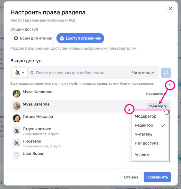 Выбрать роль для пользователя. Доступно для выбора роли: Модератор, Редактор, Читатель, Нет доступа.
