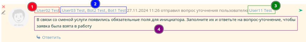- Текст комментария: «В связи со сменой услуги появились обязательные поля для инициатора. Заполните их и ответьте на вопрос-уточнение, чтобы заявка была взята в работу»