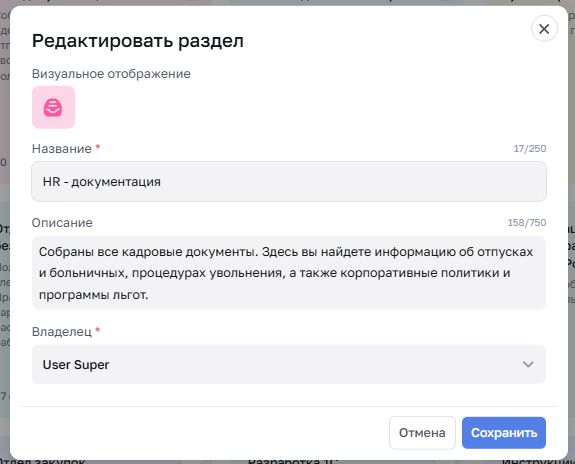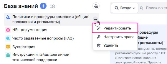 Для редактирования раздела необходимо открыть меню «Еще» рядом с разделом и выбрать действие «Редактировать». Действие доступно, как в списке разделов, так и разделов, которые отображаются в виде «плиток».
