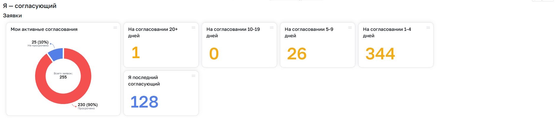 - На согласовании 10-19 дней. Отображается количество заявок, в которых вы являетесь согласующими от 10 до 19 дней.