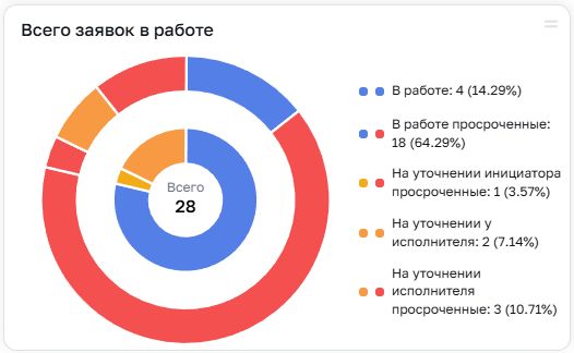 Справа отображается легенда к диаграмме. Легенда и области виджета кликабельны, при нажатии осуществляется переход в список заявок, на вкладку «На подчиненных».