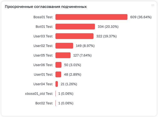 С помощью данного виджета вы можете отслеживать работу подчиненных, которые просрочили свое персональное согласование и в режиме реального времени повлиять на это. Отображается перечень ваших сотрудников и количество заявок, в которых каждый из них не принял решение по согласованию (не согласовал и не отклонил) и фактическое время его персонального согласования превышает плановое.